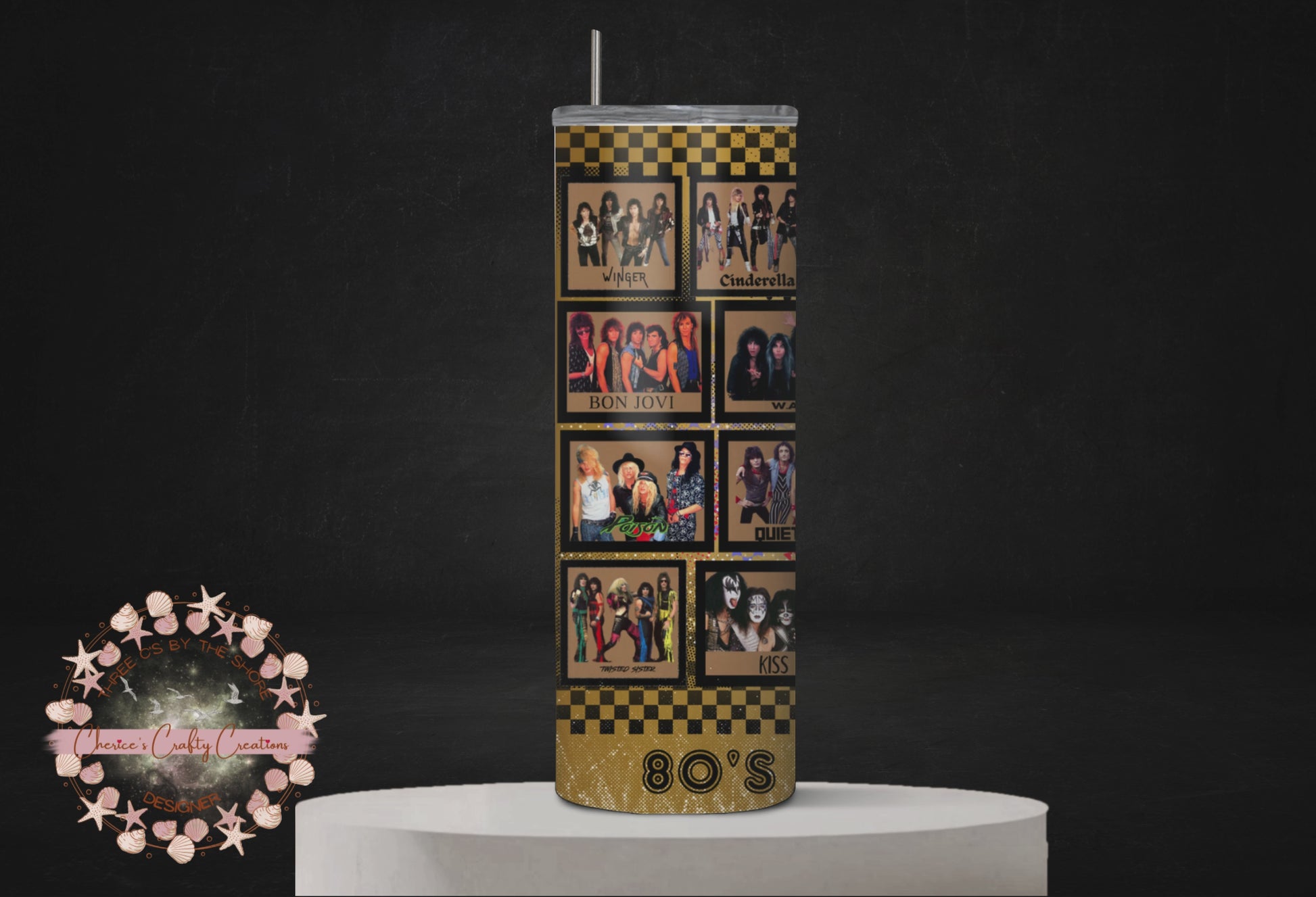 What a great way to carry around some of your favorite big hair bands from the 80's with this custom made 20 oz tumbler !