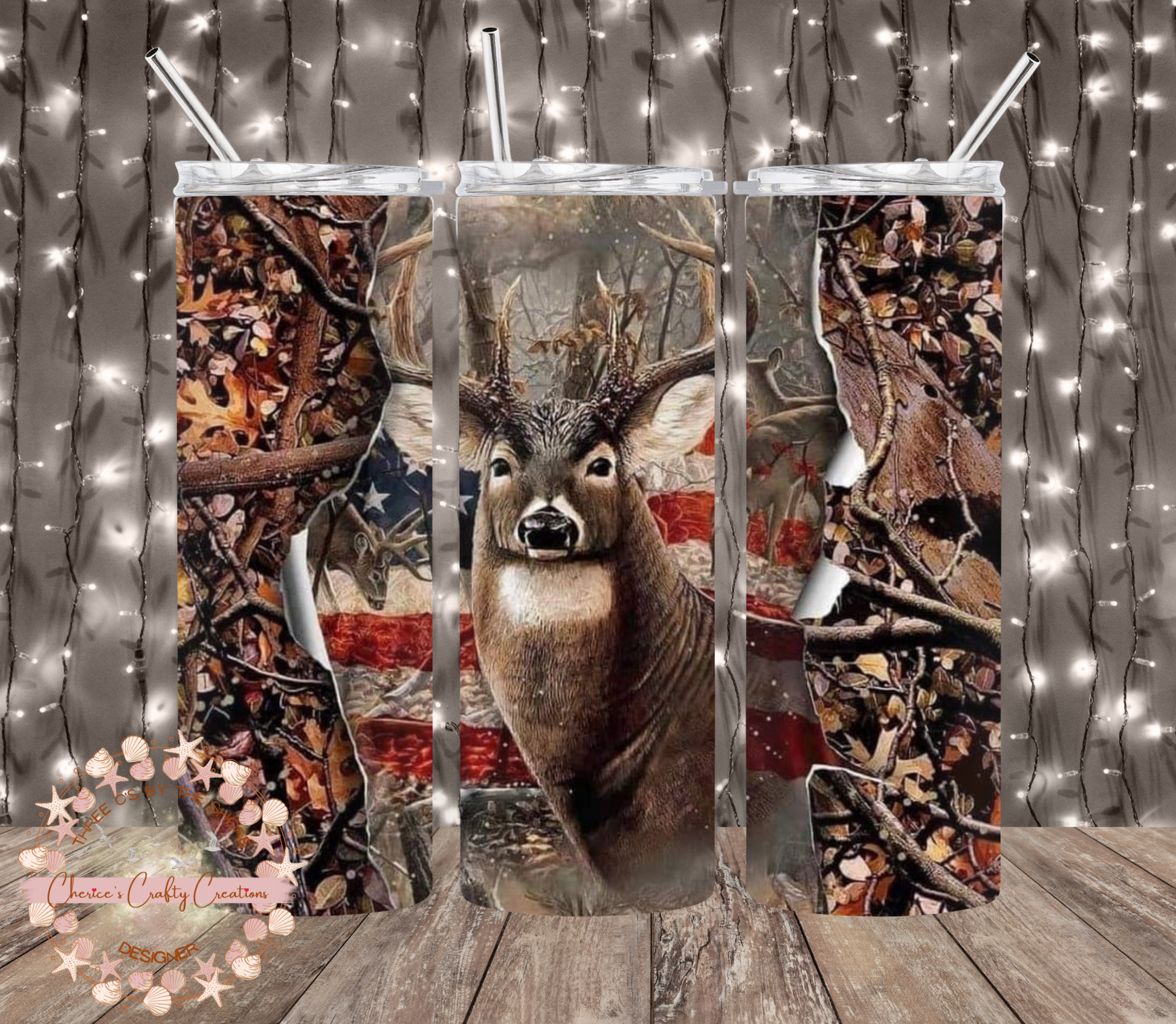 Beautiful layout of deer with the American flag in the back ground. Great ideal tumbler for those hunters or even for a just for the love the wildlife.