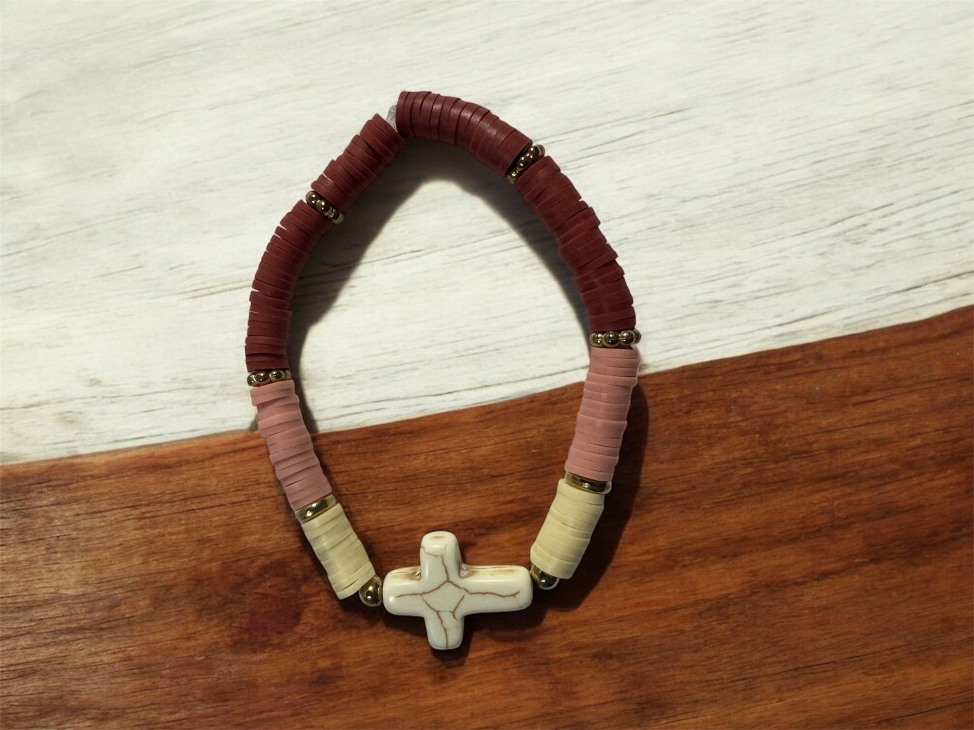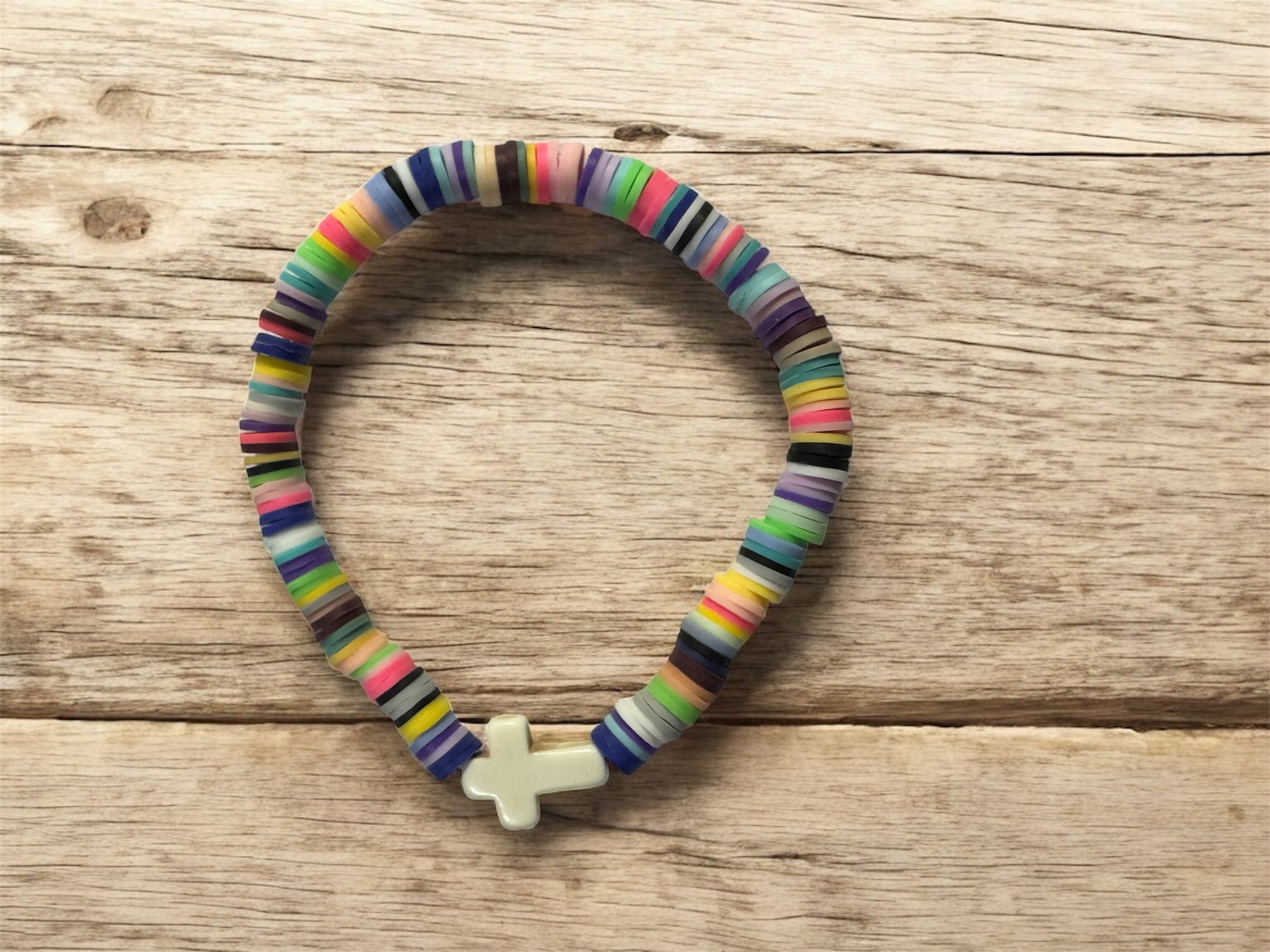 Made with colorful clay disc beads, this bracelet is fun, bright, and full of joy. Perfect for adding a pop of faith-filled color to your style. - Pink & Pearl Cross Bracelet