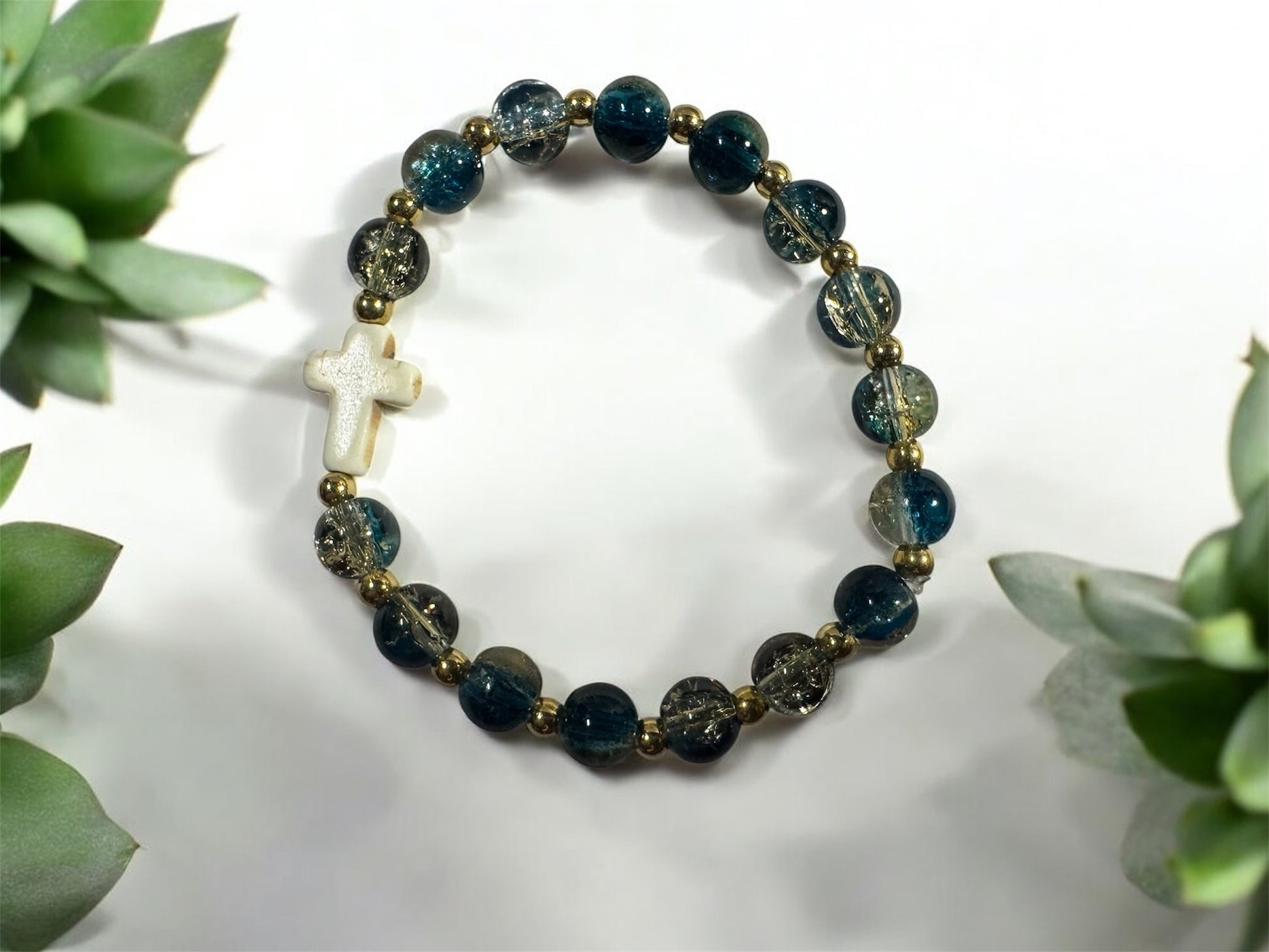 Crackled blue glass beads with gold accents and a cross centerpiece give this bracelet a radiant, uplifting glow.