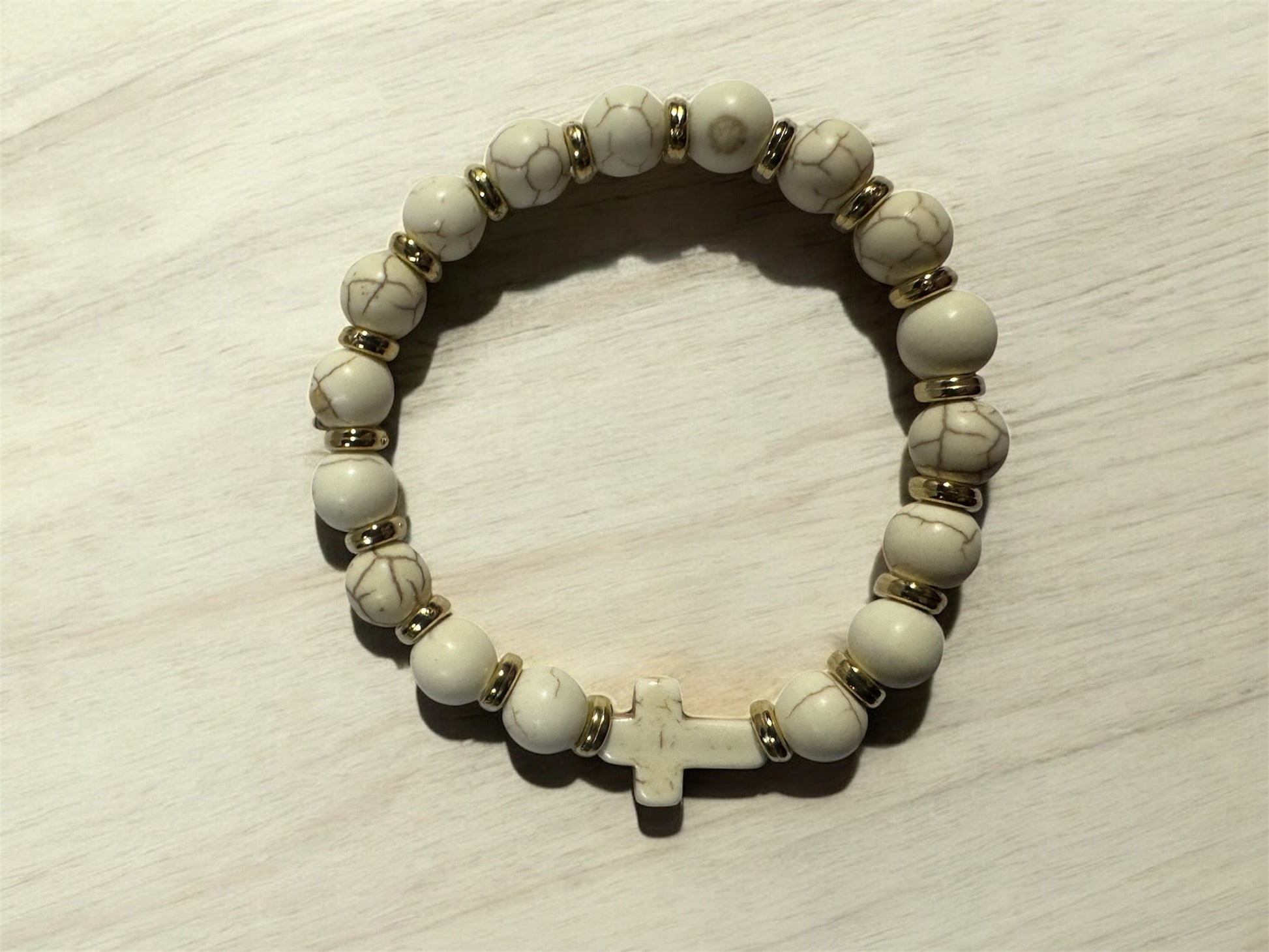 Marbled white stone beads with golden spacers create a timeless look of purity and strength. - Grey & Silver Cross Bracelet