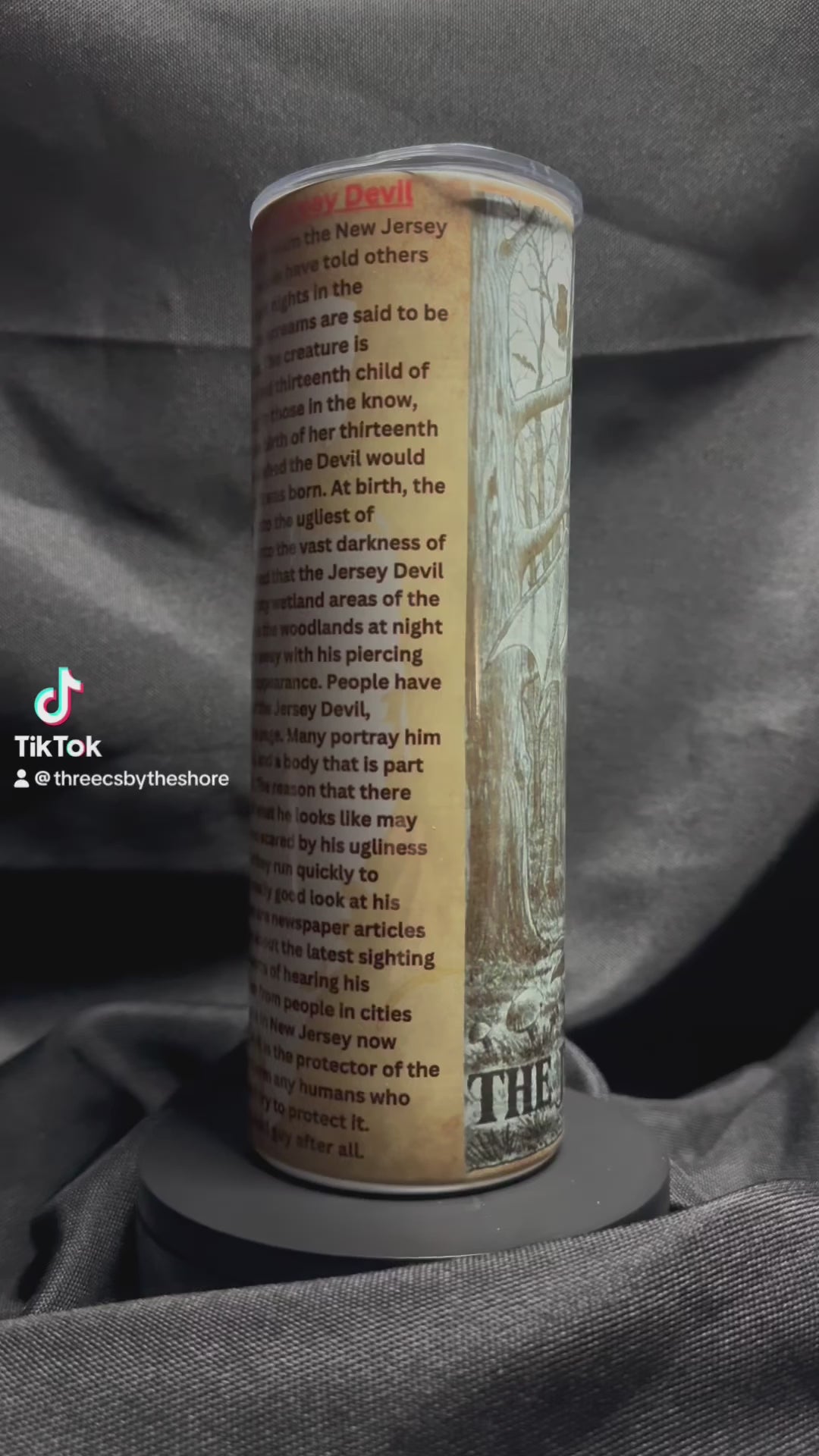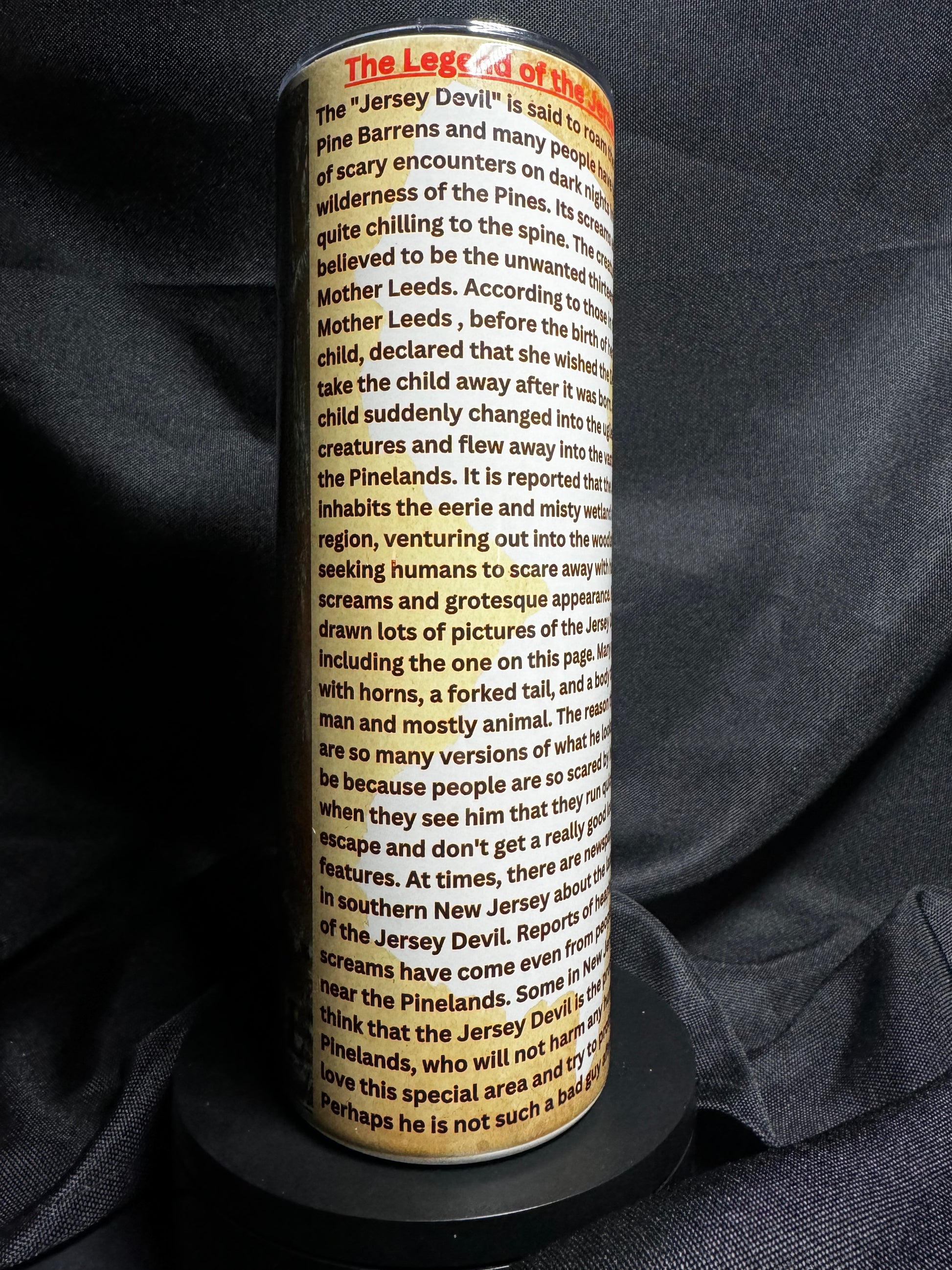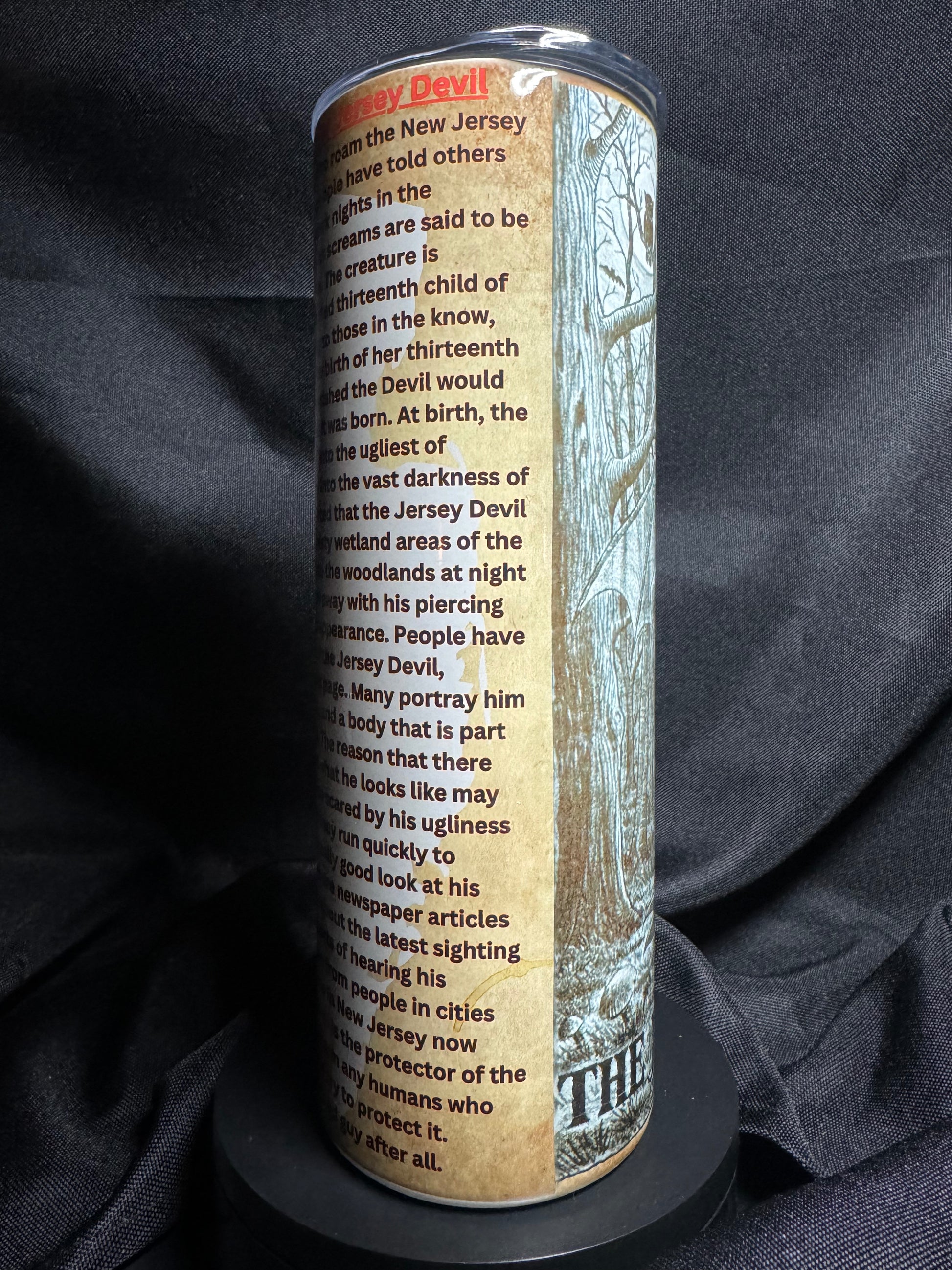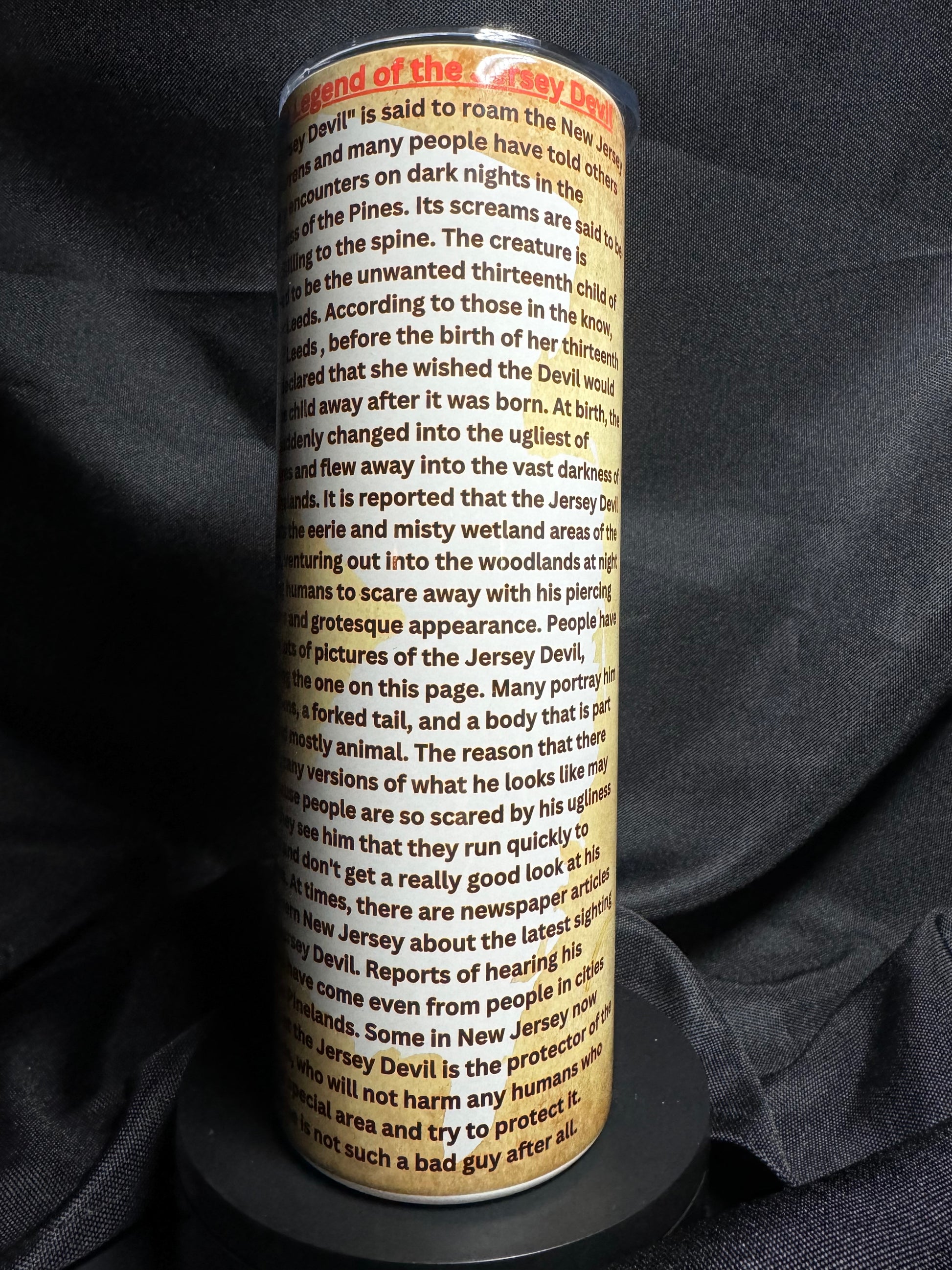 f you are a Jersian then you are aware of the Jersey Devil, for those who also is a fan of this state and visits often then you too may know the story. This tumbler represents one of Jersey's known things here in the Pine Barrens, hopefully this tumbler is the only close encounter you'll get of the Jersey Devil ๐