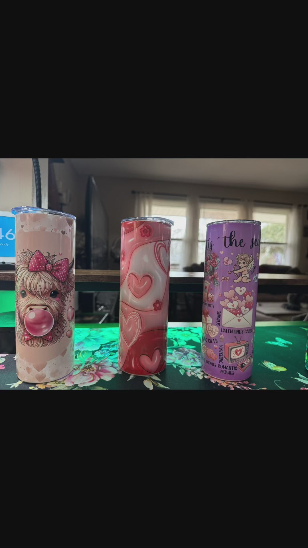 Love is in the air with these valentines tumblers; three to choose from all hearts to cute highland cow and valentines saying on another